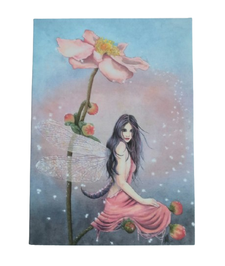 A delightfully illustrated card of a fairy beneath a flower. designed by Alexandra Dawes