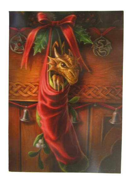 A Yule /Christmas card with a dragon in a stocking on the front cover designed by Anne Stokes