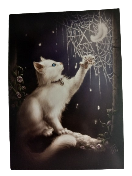 A delightful Yule /Christmas/ Winter Festival celebration card beautifully illustrated with a white kitten playing with a frosted web designed by Linda Jones