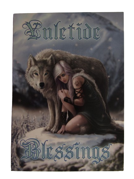 A Yule /Christmas card with 2 wolf and a woman on the front cover designed by Anne Stokes
