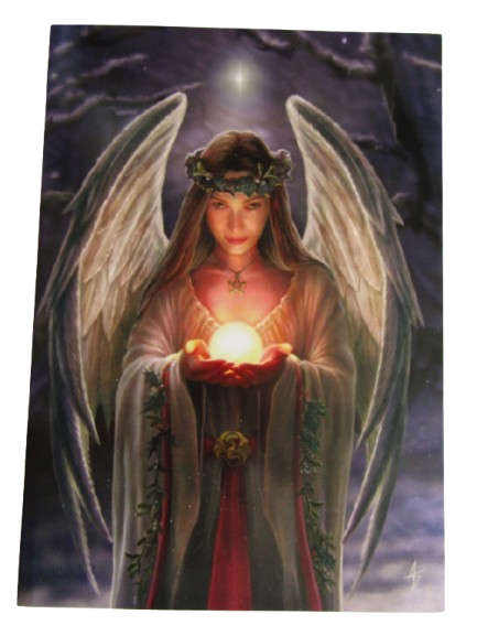 A Yule /Christmas card with an angel holding a crystal ball on the front cover designed by Anne Stokes